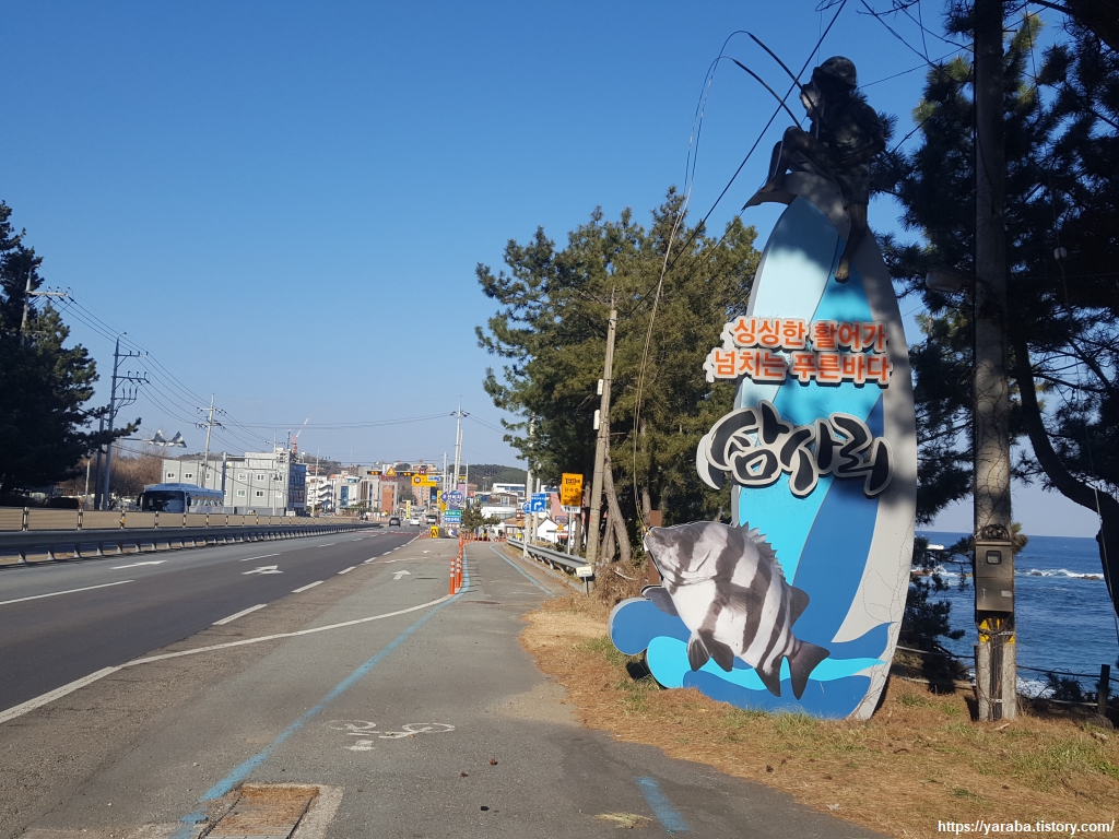 싱싱한 활어가 넘친다는 구호가 적혀 있는 삼사리 표지판. 횟감의 제왕이라는 돌돔을 그려 놓았다.