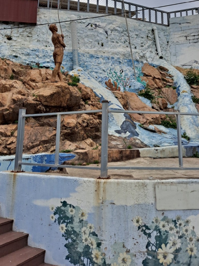 쓸모없을 것 같은 담벼락을 이용해 낚시하는 소년상을 만들어 놓았다. 주인장의 예술적 소양이 엿보인다.