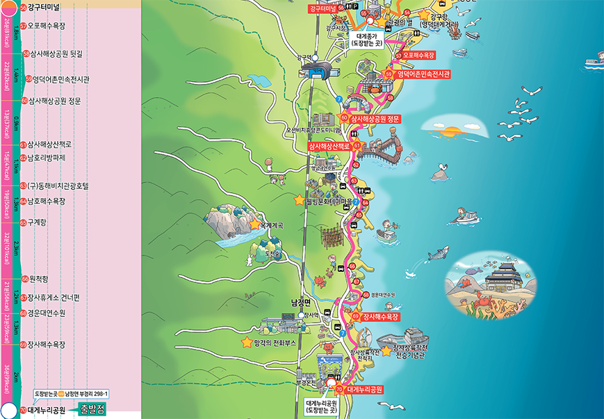 화진해변 ←4.1km→ 장사해변 ←5.1km→ 구계항 ←3.8km→ 삼사해상공원 ←2.7km→ 강구파출소 (강구버스터미널)