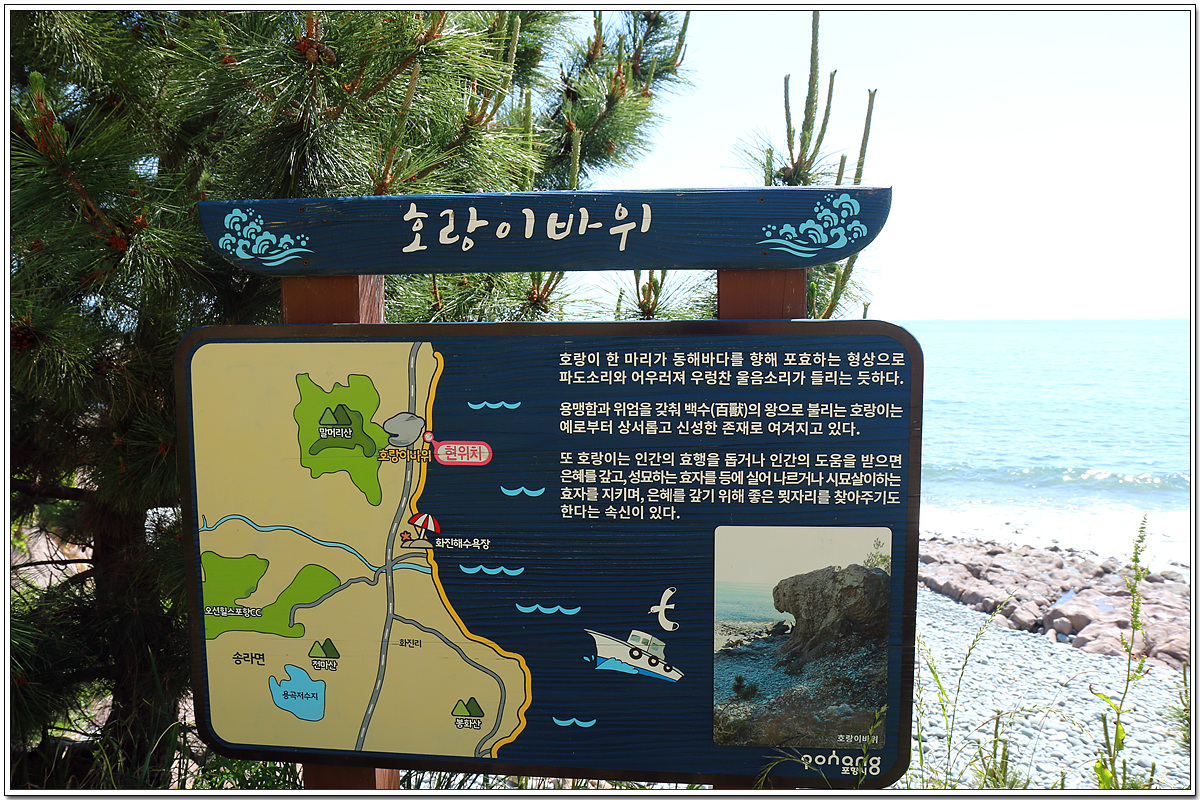 화진해수욕장은 포항지역이 거의 끝나가는 지점에 위치한다. 거기서 조금 가면 고래바위가 있고, 또 조금 더 가면 호랑이 바위가 있다. 이 호랑이 바위는 호랑이가 입을 벌리고 동해바다를 향해 포효하는 형상이다. 호랑이 한 마리가 파도소리와 어우러져 우렁찬 울음소리가 들리는 듯하다.