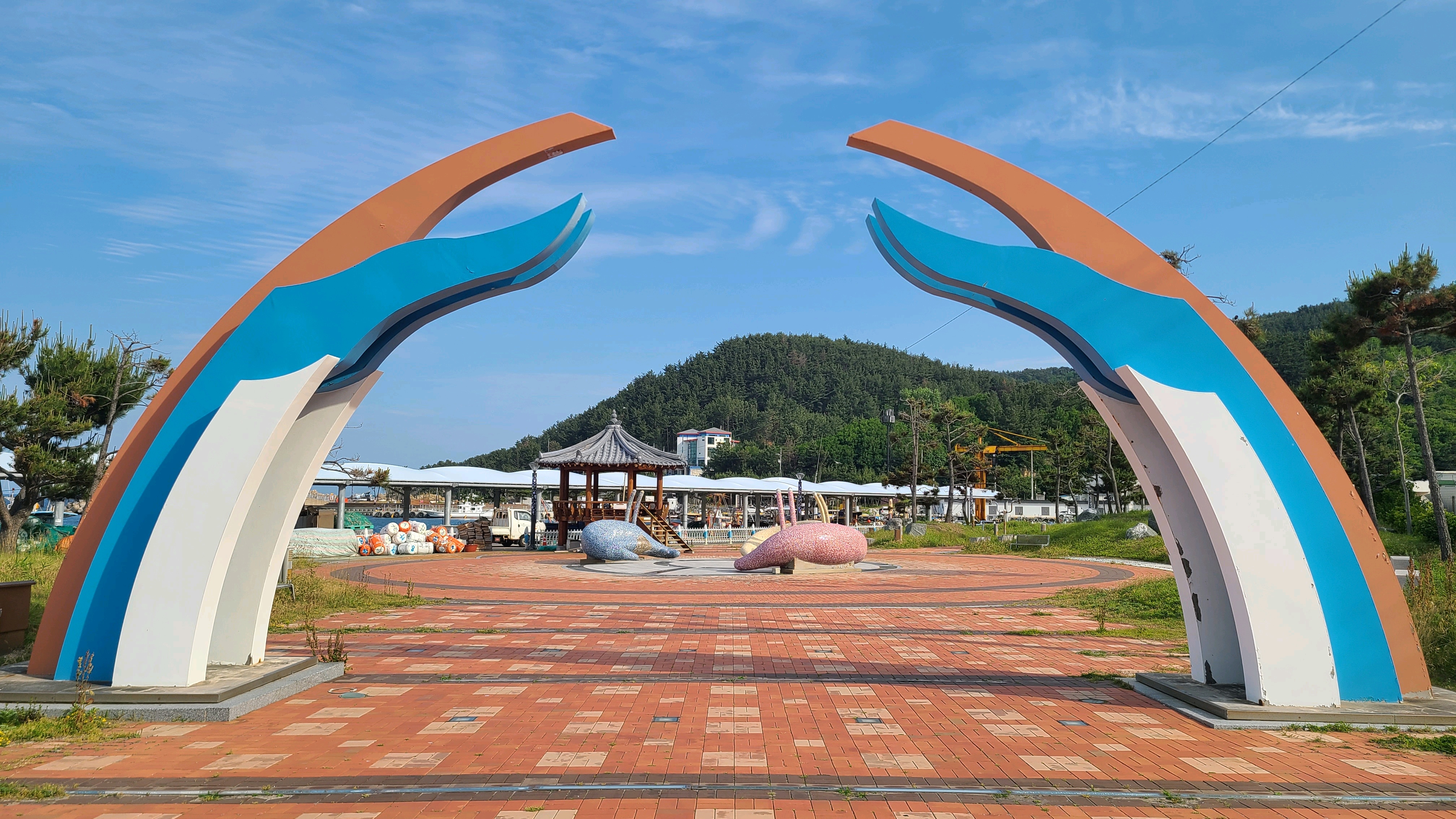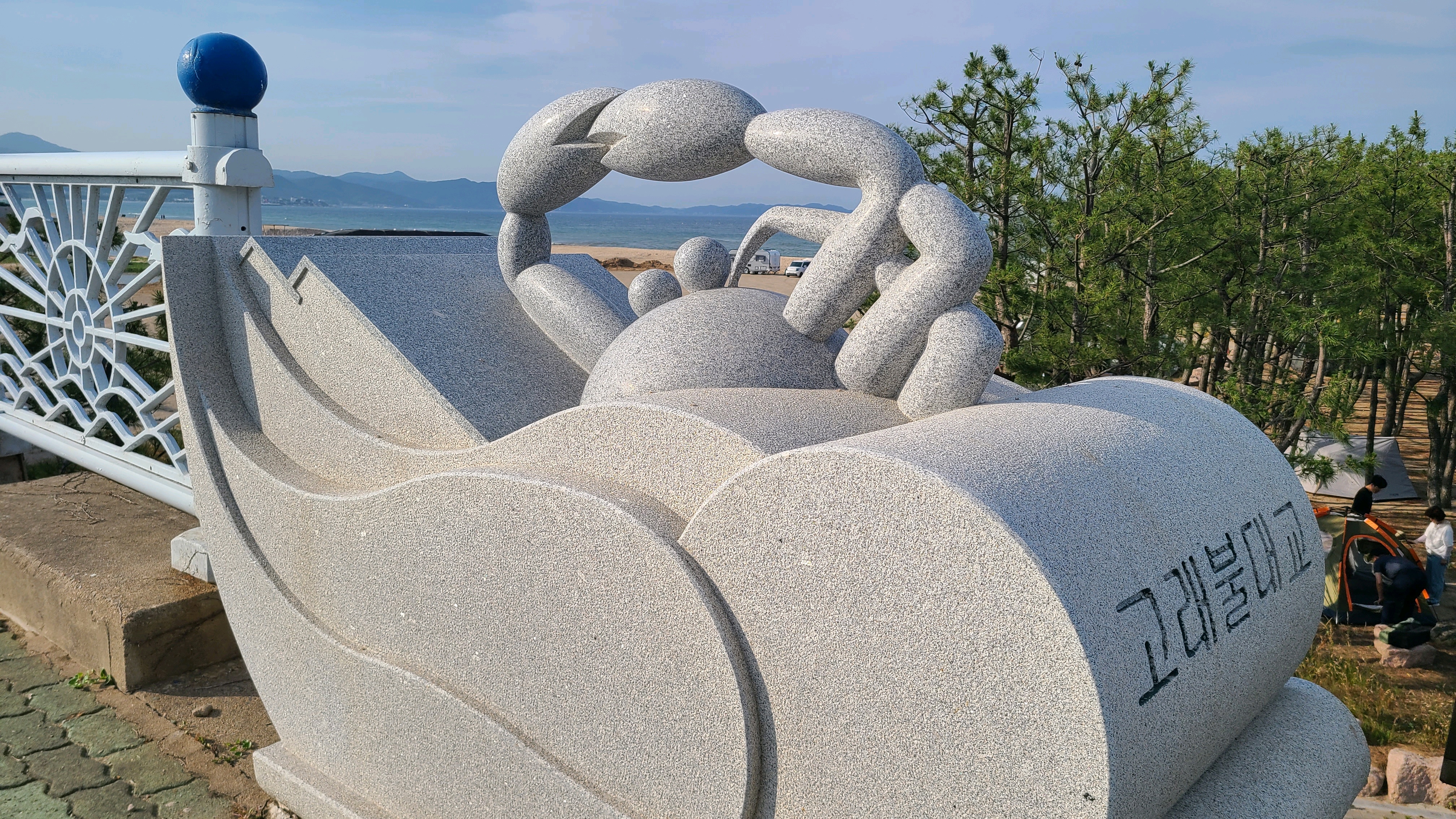 대진항(대진2리) 입구 해변공원의 대게 조형물과 벤치