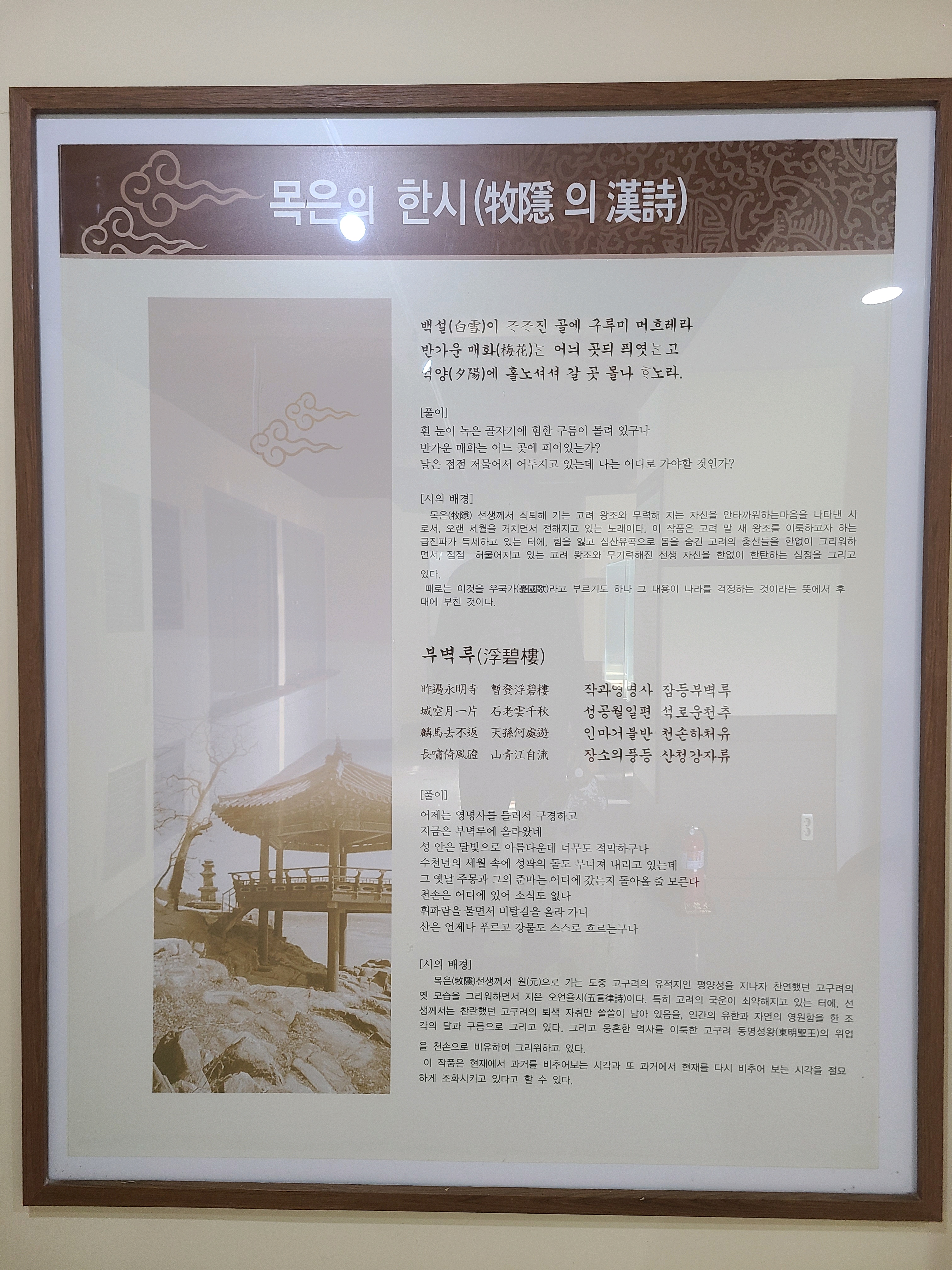 목은 이색기념관 가는 길과 관어대 가는 길 갈림길에 백운동 서원을 세운 신재 주세붕의 <망일봉>이란 시판이 설치되어 있다.