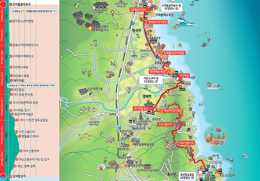축산항 ←2.3km→ 대소산봉수대 ←5.8km→ 괴시리전통마을 ←2.4km→ 대진항 ←5.6km→ 고래불해변
