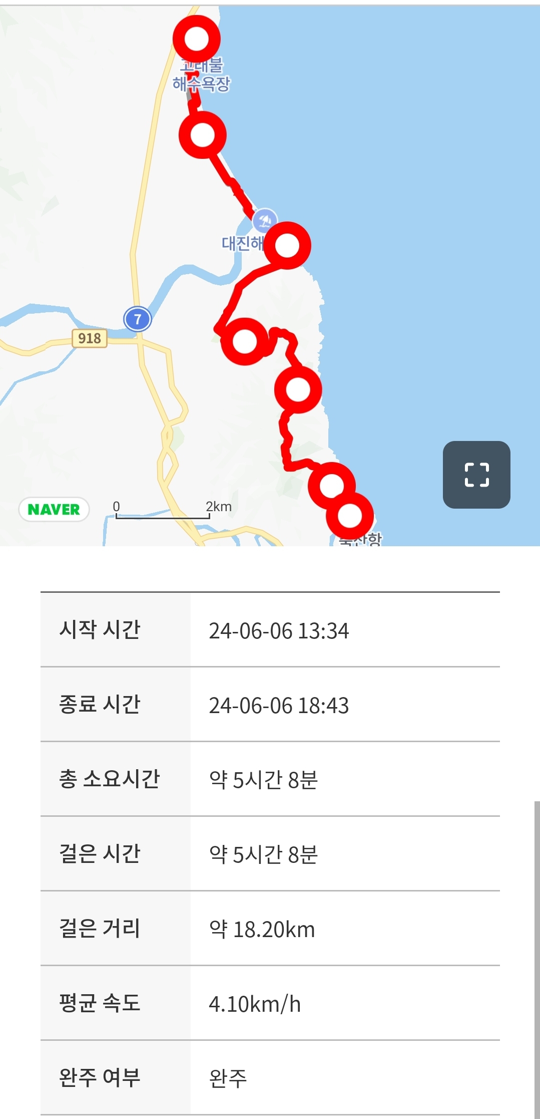 걸은시간 13:34~18:43, 5시간 8분 소요